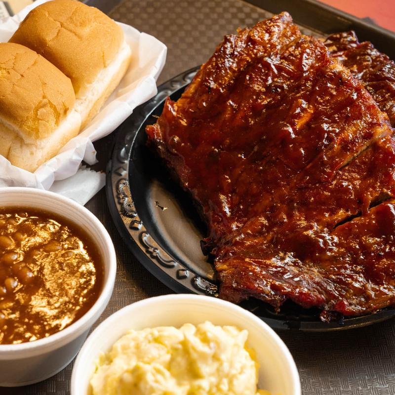 Pit-Cooked Ribs | Choice of 2 sides (Classic or Premium included!) and hushpuppies or dinner rolls (1-4oz BBQ Sauce incl; Additional Sauce-$.75)
