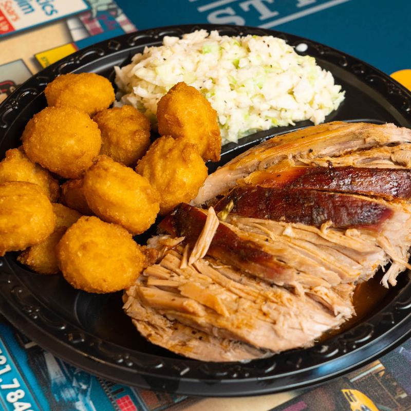 Served with BBQ slaw (or Coleslaw) | French Fries | Hushpuppies or buns/rolls | 1-4oz Dip